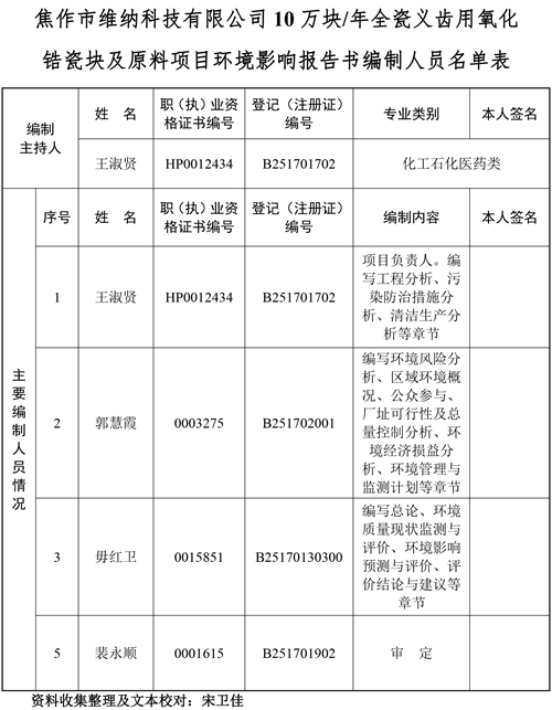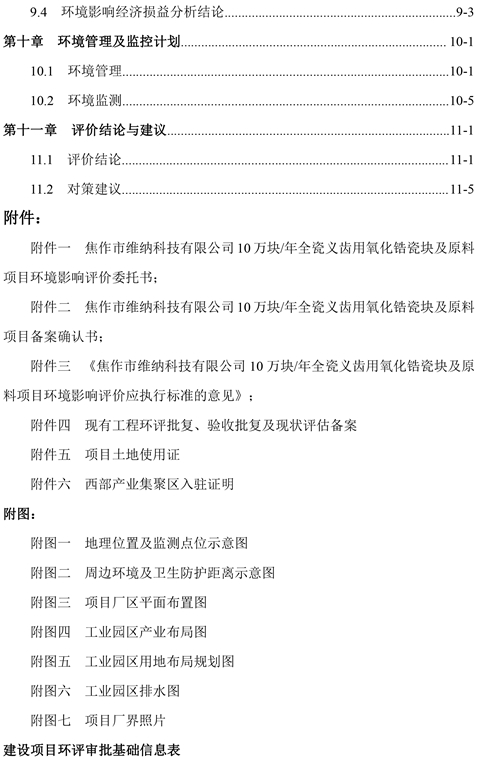 關于焦作市維納科技有限公司10萬塊/年全瓷義齒用氧化鋯瓷塊及原料項目環(huán)評報告書信息公司。