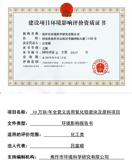 我公司10萬塊/年全瓷義齒用氧化鋯瓷塊及原料項目已由焦作市環(huán)境科學研究有限公司編制完成,現(xiàn)對報告書(報批版),予以全文信息公開。